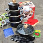 • 3pots +2pans +5lids +6 ladles +2 gloves +1apron+1scrubber +1 tong
